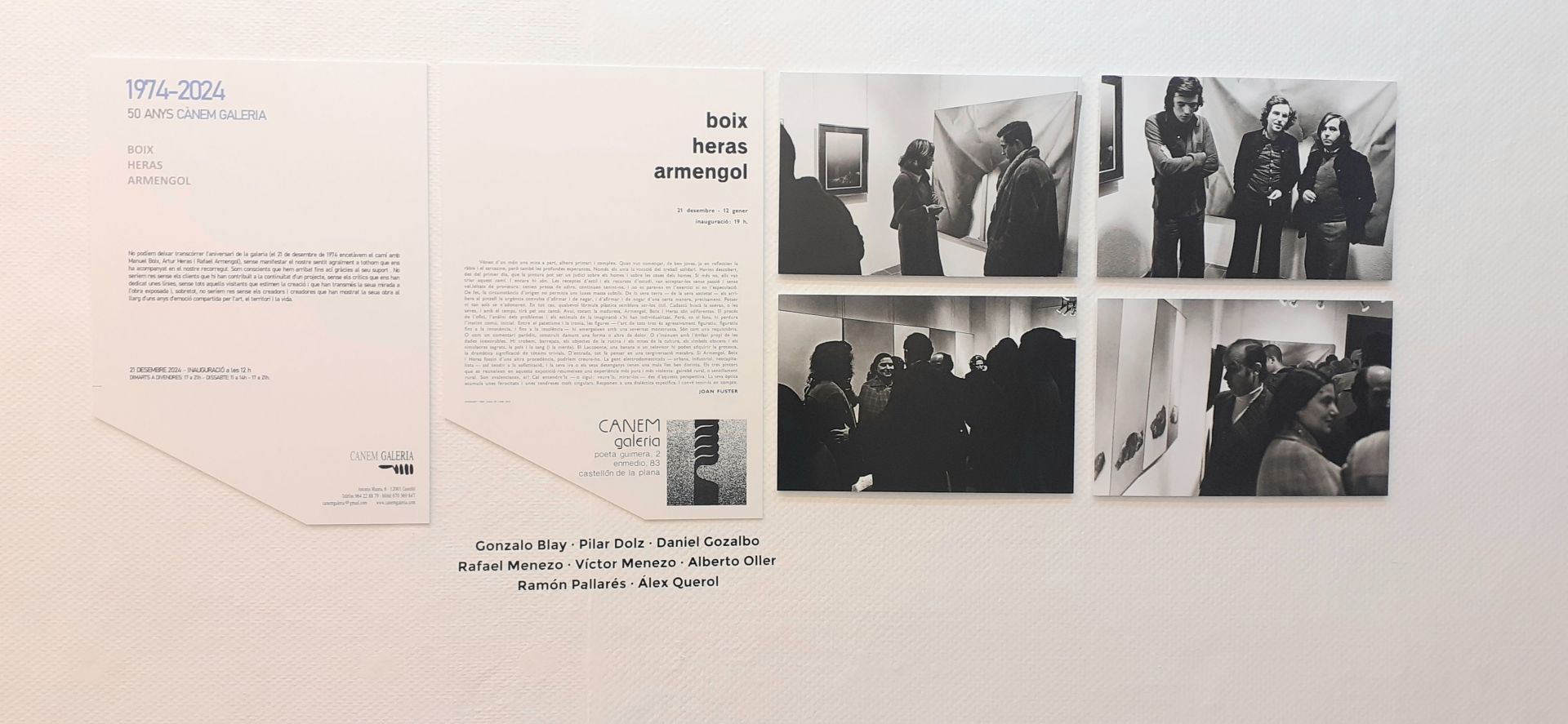 En 1974 la galeria CÀNEM començava la seua trajectòria amb l'exposició inaugural "Boix-Heras-Armengol". Uns joves i emergents creadors de l'escena artística valenciana que encarnaven una mirada precisa, valenta i lliure. Una línia de reflexió, compromís i coherència que ha estat present al llarg de 50 anys en l'obra dels tres autors i de la mateixa galeria. La seua mirada se ha desfet, refet, ha crescut celebrant la passió por l'art, el territori i la vida. Un camí que ara es retroba i es mostra en en el seu 50 aniversari. Una invitació a celebrar i a continuar.